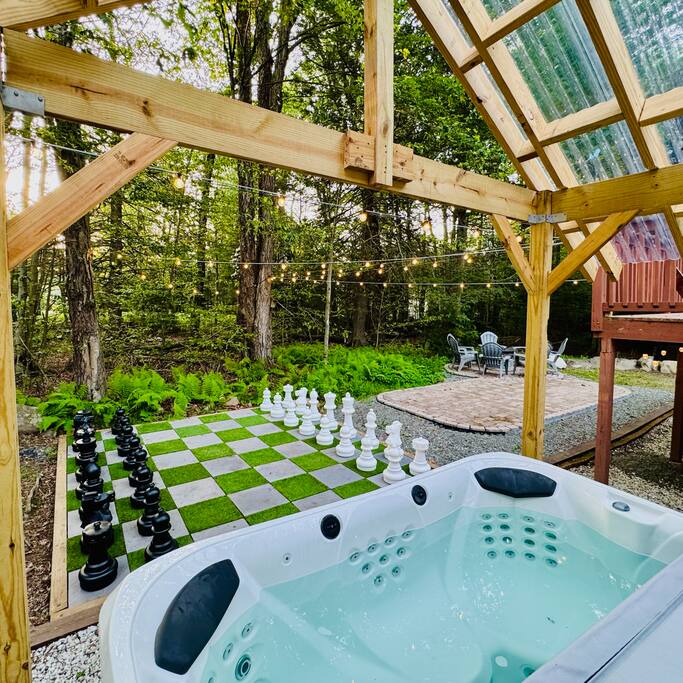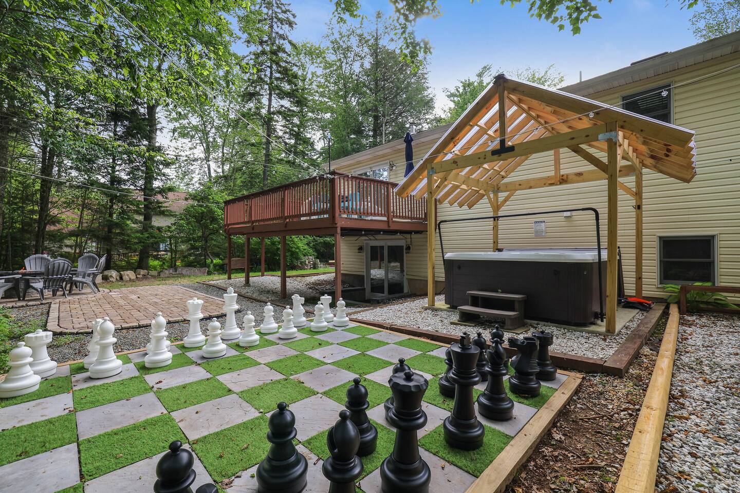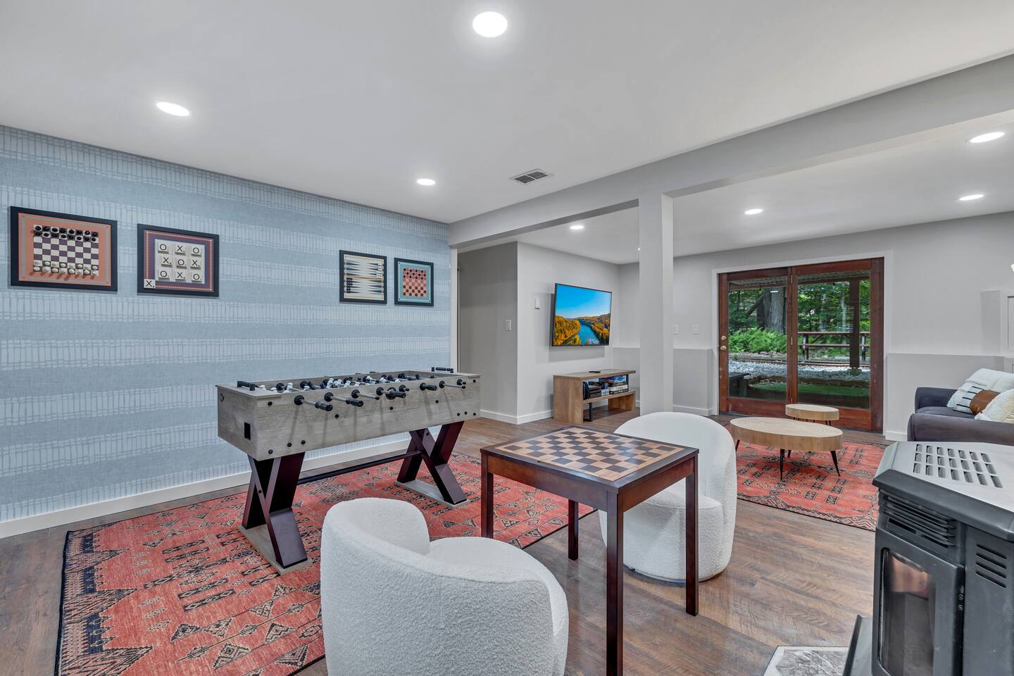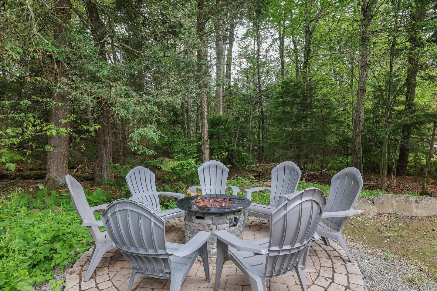 MUST BE 25 OR OLDER TO BOOK. Please take a tour through this spacious two-floor oasis to familiarize yourself with all the comforts and amenities it offers. The best place to start is the majestic open-concept design living area on the main floor. The home's heartbeat features a relaxing living room leading into the fully equipped kitchen and an inviting dining area. The same ambiance can be felt in the lower-level recreation room with the intimate pellet stove, offering an entertaining atmosphere with numerous fun amenities and spaces. Immerse yourself in the natural beauty of the area and create unforgettable memories at our vacation home. With easy access to local outfitters, you can experience the best of the great outdoors, from horseback riding to kayaking, all while enjoying the comfort and luxury of your own private oasis You don't have to leave the property to enjoy the beauty of the Poconos. Step out on the spacious deck to soak up the sun, catch a breath of fresh air, and enjoy an al fresco meal, before going down to the backyard with the luxurious hot tub and a magical fire pit! Let's dive deeper into the rich amenity list of our gorgeous getaway. ★ LOCATION ★ We are conveniently located close to many of the area's attractions. ✔ Pocono Raceway: 22-minute drive ✔ Camelback Resort: 18-minute drive ✔ Jack Frost Ski Resort: 30-minute drive ✔ Great Wolf Lodge Water Park: 17-minute drive ✔ Kalahari: 13-minute drive ✔ Tobyhanna State Park: 8-minute drive When you've had enough of the exploring the nearby attractions, come back to Pocono Farms and enjoy the fun amenities at the clubhouse: 0.6 miles away ★ LIVING & RECREATION ROOM ★ The living room is a part of the upper-floor open-concept design area. See what the chef is up to, help them set the table, or unwind on the comfortable sofa by the intimate fireplace. ✔ Comfortable L-Shaped Sofa with Pillows ✔ Smart TV ✔ Indoor Fireplace ✔ Comfy Accent Chairs ✔ Coffee Tables ✔ Designer Reading Lamps When you've had enough of the outdoors, retreat to the recreation room on the lower level, where you'll discover many entertaining amenities to have hours of fun with your family and friends. ✔ Cozy Sofa with Pillows (can be converted into a Queen-Sofa Bed) ✔ Smart TV ✔ Foosball Table ✔ Chess/Checkers Table ✔ Board Games ✔ Pellet Stove/Fireplace ✔ Access to the Backyard ★ KITCHEN & DINING ★ The fully equipped kitchen features modern appliances for preparing delicious snacks, breakfasts, or three-course gourmet dinners. Ample countertops and the central kitchen island offer plenty of room to unleash your cooking creativity. ✔ Microwave ✔ Stove ✔ Oven ✔ Toaster ✔ Blender ✔ Air Fryer ✔ Keurig Coffee Maker (Complimentary K-Cups) ✔ Hot Water Kettle ✔ Refrigerators/Freezer ✔ Dishwasher ✔ Sink - Hot & Cold Water ✔ Plates ✔ Glasses ✔ Silverware ✔ Pots & Pans Unwind and catch up with your loved ones on the lavish deck or in the backyard while the food is getting ready. When done, serve it on the dining table and enjoy a delicious meal in an inviting and warm atmosphere. ✔ Dining Table with Seating for 8 ✔ Waterfall Kitchen Island with Seating for 4 ✔ Access to the Back Deck ★ SLEEPING ARRANGEMENTS – 5 BEDROOMS ★ Five tastefully furnished bedrooms are designed to provide hotel-like comfort and convenience needed to relax and rest so you can remain energized and do everything you have planned the next day. ♛ Master Bedroom (Main Floor): King-Size Bed, HDTV, Ensuite Bathroom, Workspace (Desk, Chair, Lamp) ♛ Bedroom 2 (Main Floor): Queen-Size Bed, HDTV ♛ Bedroom 3 (Lower Floor): Queen-Size Bed, HDTV ♛ Bedroom 4 (Lower Floor): Bunk Bed (Double over Two Twins), HDTV ♛ Bedroom 5: Queen-Size Bed All bedrooms come with a similar set of amenities. ✔ Premium Pillows, Linens, and Sheets (additional sets for the sofa beds) ✔ HDTVs (all Bedrooms except #5) ✔ Ceiling Fans (all Bedrooms except Master and #4) ✔ Closets with Hangers and Shelves (all bedrooms except #5) ✔ Night Stands with Reading Lamps ✔ Blackout Curtains ★ BATHROOMS ★ The accommodating house features three full bathrooms stocked with essential toiletries and pampering towels to ensure a carefree stay. ✔ Japanese Soaking Tub with a Walk-In Shower (Master Bath) ✔ Bathtub with a Shower ✔ Vanity (Double in the Master Bath) ✔ Towels ✔ Hair Dryer ✔ Toilet ✔ Essential Toiletries ★ DECK & BACKYARD ★ A stunning getaway would not be complete without a private space where you can take in tranquility, catch a breath of fresh air, relax in the luxurious hot tub, and enjoy a refreshing drink while marveling at the gorgeous surroundings. Let the designated master work their magic on the grill before gathering for an unforgettable al fresco meal worthy of the most praised restaurants. ✔ Luxury Hot Tub with a cover ✔ Fire Pit with Surrounding Seating ✔ Life size chess board ✔ Picnic Table with Benches ✔ Upper-Floor Patio (Dining Table with Benches + Parasol + Propane Grill) As the sun goes down, sit around the magical fire pit to share stories and marvel at the starry sky. Please let us know if you have any questions regarding our retreat. Happy Travels!