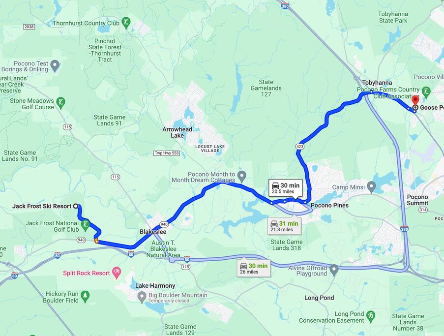 The gorgeous home is a part of the Pocono Farms Country Club, a hidden gem nestled in the scenic beauty of Tobyhanna, PA! This premier destination offers an unforgettable experience for guests seeking relaxation and recreation. Nature lovers will be captivated by the picturesque landscapes surrounding the club. Embrace the serenity of the professional 18-hole golf course, where golfers of all skill levels can enjoy a round amidst stunning views and well-manicured fairways. For those seeking adventure, the club provides a plethora of outdoor activities. Explore the nearby hiking trails, where you can immerse yourself in the tranquility of the Pocono Mountains. In the winter months, delight in thrilling snow sports at nearby ski resorts. Families are in for a treat with the array of amenities available. Take a dip in the sparkling swimming pool, have a friendly tennis match, or enjoy a fun-filled day at the playgrounds. Indulge in delectable cuisine at the on-site restaurant, offering a diverse menu offering something for every palate and delightful culinary creations. Savor your meals with panoramic views of the surrounding nature, making every dining experience a memorable one. Experience the beauty of Tobyhanna, PA, and create cherished memories with your loved ones. Here are some places of interest you'll be surely looking to visit during your stay: ★ OUTDOOR ADVENTURES ★ ✔ Skirmish Paintball Fields (35 mins away) ✔ Alvins Offroad Playground - ATVs & Dirt Bikes (18 mins away) ✔ Austin T. Blakeslee Natural Area (22 mins away) ✔ Pocono Whitewater Rafting (35 mins away) ✔ Hickory Run State Park (36 mins away) ✔ Hickory Run Boulder Field (52 mins away) ✔ Beltzville State Park (50 mins away) ✔ Big Pocono State Park (8 mins away) ✔ Tobyhanna State Park (9 mins away) ✔ Lost River Caverns (1h away) ★ GOLF, WINERY, WATERPARKS, CASINO, SHOPPING ★ ✔ Big Creek Vineyard (42 mins away) ✔ Hideaway Hills Golf Club (42 mins away) ✔ Kalahari Waterpark (12 mins away) ✔ Blue Ridge Estates Winery and Vineyard (40 mins away) ✔ The Crossings Outlets (16 mins away) ✔ Pocono Brewery (12 mins away) ✔ Great Wolf Water Park (18 mins away) ✔ Mount Airy Casino (12 mins away) ✔ Camelback Waterpark (24 mins away) ★ SKIING, SNOWBOARDING, SNOW TUBING ★ ✔ Big Boulder Ski Area (28 mins away) ✔ Jack Frost Ski Resort (30 mins away) ✔ Camelback Mountain Resort (22 mins away) ✔ Blue Mountain Resort (55 mins away) ✔ Shawnee Mountain Ski Area (40 mins away) ★ AIRPORTS ★ ✔ Wilkes-Barre / Scranton Airport (32 mins away) ✔ Lehigh Valley International Airport (1h away) ★ MAJOR CITIES ★ ✔ New York, NY (2h away) ✔ Philadelphia, PA (2h away) ***Distance times are calculated if traveling by car.
